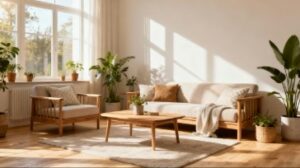 観葉植物の自然なグリーンと、ソファーや家具のナチュラルな雰囲気が調和し、視覚的にも心が落ち着くようなイメージに仕上がっています。窓から差し込む光が部屋全体に広がることで、日常の中のゆったりとした時間を思わせるやさしい空気感が漂い、暮らしをテーマにした記事やインテリア紹介に特に適しています。雑貨の販売ページや部屋づくりの参考イメージとしても活用しやすい素材です。