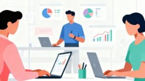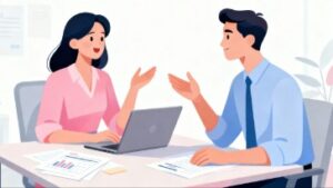 チームメンバーがオフィスのデスクで会話しながら、業務を進めているシーンを描いたフラットベクターイラストです。会議ほど堅くなく、それでいて自然なビジネスコミュニケーションの風景が伝わる構図になっており、働く人の雰囲気をやわらかく伝えたいときに最適な素材です。背景は白ではなくカラーのため、場面に立体感が生まれ、資料のアクセントとしても役立ちます。この素材は商用利用可能なフリー画像として提供しており、Webサイトやブログ、印刷物などあらゆる用途で安心してご利用いただけます。また、シンプルかつ洗練されたフラットベクタースタイルなので、色調変更や切り抜きなどの編集も簡単です。コミュニケーション活性化、社内ミーティング、プロジェクト進行、チームワーク向上などに関するコンテンツに最適なフリー素材として、ぜひ活用してください。
