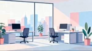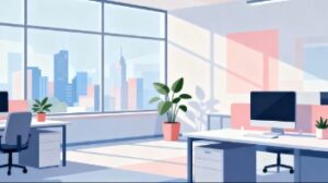 こちらのフラットベクターイラストは、都会のビルにあるオフィスの一室をモチーフに、デスクやパソコン、観葉植物をバランスよく配置したレイアウトを描いたフリー素材です。フラットデザインのシンプルで洗練された表現が、ビジネスシーンに馴染みやすく、Webサイト、ブログ、企業資料など、幅広い媒体で使いやすいイラストとなっています。特に、働きやすい職場環境や整理されたワークスペースを表現したい場面で高い相性を発揮します。