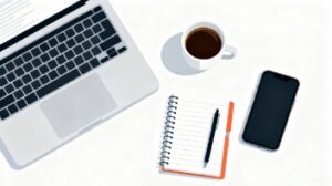 こちらは、白背景にデスクが描かれ、その上にノートパソコン、コーヒー、ノート、スマホが整然と並べられたフラットベクターイラストのフリー素材です。シンプルでありながら洗練された構図になっており、ビジネス、ライフスタイル、働き方、リモートワーク、勉強、作業環境など幅広いテーマと相性が良いデザインです。フラットなテイストで描かれているため、ブログ記事、Webサイトのアイキャッチ、企業の資料、SNS投稿など多くの場面で使いやすく、視覚的に清潔感と整った印象を与えてくれます。