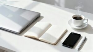白を基調とした落ち着いたデスクの上に、ノートパソコン、ノート、ペン、スマートフォン、そして温かみのあるコーヒーカップがバランスよく並べられたフォト素材です。全体にモノクロに近いトーンがかかっており、クリーンで洗練された印象を与えながらも、どこかぬくもりのある静かなワークシーンを表現しています。余計な装飾を排したシンプルな構図は、おしゃれな雰囲気を保ちつつ、資料作成・ブログ・ビジネスサイトなど、あらゆる場面で使いやすい万能なイメージです。