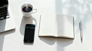 ノートパソコンは作業の中心として配置され、ノートやペンが添えられていることで、アイデアを書き留めたり考えを整理したりするワークフローを自然に感じさせます。また、手元に置かれたスマートフォンは現代の働き方に欠かせないデジタルツールとしてリアリティを加え、コーヒーカップが、ひと息つきながら集中する時間をイメージさせてくれます。この組み合わせは、ビジネス・学習・クリエイティブ作業のどれを表現したい場合でも柔軟に対応でき、白背景が全体の雰囲気をすっきりとまとめあげています。