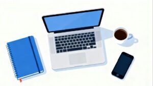 白背景をベースに、デスクの上にノートパソコン、コーヒーカップ、ノート、スマホが並ぶ、落ち着いた印象のフラットベクターイラストのフリー素材です。余計な情報を排除したミニマルな構成のため、作業環境の清潔感や集中しやすいワークスペースの雰囲気を伝えるのに最適なデザインとなっています。ビジネス系のブログ、IT系の記事、在宅ワークや副業、資格勉強などのテーマにも自然にマッチします。