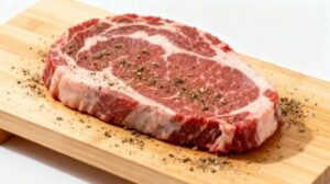 白背景の上に、サーロインステーキの生肉を木製まな板に置き、塩とコショウで軽く下味をつけた調理前の状態を丁寧に撮影した無料のフリー画像素材です。牛肉の質感が際立つ構図で、厚みのあるサーロインならではの美しい赤身と脂身のバランスがしっかりと表現されています。料理工程の“始まり”を思わせる雰囲気があり、手料理・グルメ・食材紹介・レシピ系のコンテンツに非常に相性の良い一枚です。