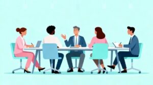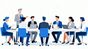 オフィスでチームメンバーがデスクを囲み、フレンドリーな雰囲気で会議を行っているシーンを描いたフラットベクターイラストです。白背景のシンプルな世界観は、採用ページや企業紹介資料、スタートアップのサイト、サービス説明ページなど、幅広いシーンで活用できます。当サイトでは商用利用可能なフリー画像として提供しており、自由に加工・編集が可能です。ビジネスの現場における協力体制、チームワーク、企画会議、人材育成など、企業活動を象徴するテーマと非常に相性が良く、視覚的にわかりやすい表現が求められる資料にも最適です。フラットベクターの柔らかいデザインはユーザーに安心感を与え、サイトの印象を向上させる効果も期待できます。フリー素材として高品質なビジネスイラストをお探しの方に特におすすめです。