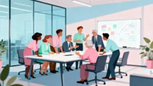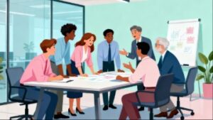 こちらのミーティング風景を描いたフラットベクターのビジネスイラストは、デスクを囲んで話し合うビジネスパーソンの様子を丁寧に表現したフリー素材です。背景が白ではなく、柔らかい色の空間が設定されているため、チームワークやコミュニケーションを視覚的に伝えたいデザインに最適です。商用利用可能なフリー画像のため、自社サイトのバナー制作、企業ブログの記事挿入、サービス紹介ページ、資料・プレゼン、SNS投稿など、多岐にわたって活用できます。フラットイラストは視認性が高く、読み手に余計な情報を与えず、内容をスマートに補足できるのが魅力です。ビジネス関連の表現では、協働、戦略会議、プロジェクト共有といったテーマで使用することで、直感的に内容を伝えやすくなります。無料で使える高品質素材として、デザイナー・広報担当者・個人クリエイターに強くおすすめできるイラストです。
