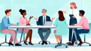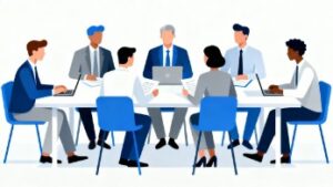 オフィスで社員たちがデスクを囲み、活発に会議やミーティングを行っている様子を描いたフラットベクターイラストです。ビジネスシーンをシンプルかつ洗練されたデザインで表現しており、資料作成やブログ記事、企業サイト、プレゼンテーションなど幅広い用途で活用できます。当サイトでは、フリー画像として無料でダウンロード可能で、商用利用も認められているため、安心してご使用いただけます。背景は白を基調としたミニマルデザインで構成されており、どんなレイアウトにも合わせやすく、デザイン初心者にも扱いやすい点が魅力です。フリー素材として提供しているため、プロジェクトの雰囲気に合わせた加工も自由に行えます。ビジネス関連のブログ、マーケティング資料、人事や採用ページの挿絵としても最適です。チームワーク、コミュニケーション、働き方、プロジェクト管理などのキーワードと相性が良く、SEO対策としても効果的な素材です。