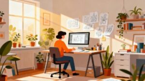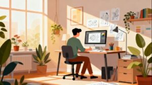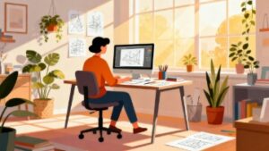 自宅の壁に写真やポスター、書物が飾られたクリエイティブなワークスペースを背景に、デスクでノートパソコンを使って仕事をするテレワークシーンをフラットベクターイラストで表現しました。雑多になりがちな在宅ワークの風景を、フラットで整ったデザインに落とし込むことで、柔らかく洗練されたビジュアルに仕上がっています。本フリー画像は無料でダウンロード可能なフリー素材で、商用利用可能なため、制作物に安心して使用できます。リモートワーク特集記事、働き方改革に関する資料、YouTubeサムネイル、社内研修資料、在宅勤務者向けのガイドライン、オンライン学習関連のページなど幅広い用途に最適です。編集しやすいベクター形式のため、色や構図の調整にも対応しやすく、幅広いデザイン制作をサポートします。