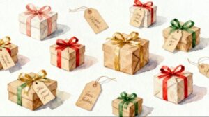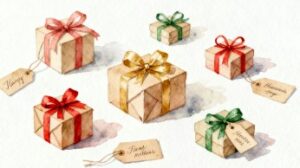 白背景のシンプルな構成は、サイトやブログのアクセント、バナー制作、季節イベントのお知らせ、ショッピングサイトのキャンペーン画像など、幅広い用途で活用できます。特にプレゼントボックスが整然と並ぶレイアウトは、期待感や特別感を自然に伝えられるため、閲覧者の気持ちを明るく、少しだけ特別な気持ちにしてくれます。フリー画像として扱いやすく、オシャレでお洒落な雰囲気を求めるデザインにもぴったりです。