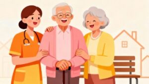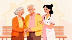 笑顔で寄り添う老夫婦と、そのそばでやさしく見守る看護師を描いた、心暖まる雰囲気の人物イラスト素材です。穏やかな表情の夫婦と、安心感を与える看護師の存在が調和し、見る人に心温まる印象を自然に伝えてくれます。医療や介護の現場では不安や緊張を感じやすい場面も多くありますが、本イラストは安楽で落ち着いた空気感を大切にしたフラットデザインのため、やさしく親しみやすいイメージ表現が可能です。