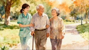 笑顔で寄り添いながら歩く老夫婦と、そのそばでやさしく見守る看護師を描いた、心暖まる人物のフラットデザインイラスト素材です。穏やかな表情の夫婦と、安心感を与える看護師の存在が自然に調和し、見る人にやさしさと安楽な印象を伝える一枚となっています。水彩画風の柔らかな雰囲気を取り入れつつ、全体はミニマルでシンプルなフラットデザインにまとめられており、情報を邪魔しない落ち着いたイメージが特長です。
