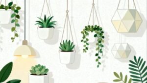 白背景に、多肉植物が床に整然と並び、上から観葉植物が吊り下がる構図をシンプルに描いた、ミニマルでおしゃれなフラットデザインのイラスト素材です。白背景の持つ清潔感と余白の美しさにより、植物の柔らかなグリーンがより引き立ち、ナチュラルで優しい印象を与えるイメージに仕上がっています。多肉植物の丸みや個性を抑えつつも特徴をしっかり捉えた表現、そして上部に吊るされた観葉植物がバランスよく構図を整え、シンプルで飽きのこないフリー素材としてデザインされています。