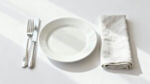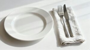 白い皿の滑らかさ、整然と配置されたナプキンやカトラリーのバランスが、モダンでオシャレな空気を漂わせています。シンプルだからこそ、上品さやクリーンな印象が引き立ち、ミニマルなデザインを好む方にもぴったりです。ナイフとフォークが持つ金属の質感も、白を基調とした空間にほどよいアクセントとして映え、全体のまとまりをより美しく見せてくれます。