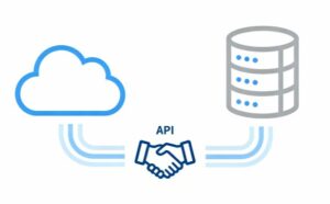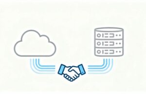 白背景に配置されたミニマルでシンプルなフラットデザインのイラスト素材です。2つの異なるデジタルシステムを象徴するサーバーアイコンが描かれ、両者の間には抽象的なデータ伝送ラインが伸び、中央にはAPIによる握手アイコンが配置されています。システム統合や連携が正常に行われている様子を視覚的にわかりやすく表現しており、プログラミングやAPI接続に関する説明を行う際のイメージとして非常に使い勝手が良い素材です。