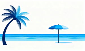 白背景に広がる砂浜と海、そしてヤシの木のそばに立つパラソルをモチーフにした、夏のビーチを描いたフラットデザインのイラスト素材です。余計な装飾を省いたミニマルでシンプルな構成により、夏らしい開放感やリゾート感をすっきりと表現しており、見る人に爽やかな印象を与えます。白背景のため全体が軽やかにまとまり、ビーチや海のイメージが直感的に伝わるイラストとなっています。
