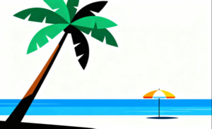 白背景に広がるビーチの情景を、ミニマルでシンプルなフラットデザインとして表現したイラスト素材です。砂浜に立つパラソルと、のびやかに生えるヤシの木、そして穏やかな海のイメージが組み合わさることで、夏らしい開放感やリラックスした雰囲気を分かりやすく伝えています。余計な装飾を省いたフラットな表現のため、見る人にとって直感的に理解しやすく、さまざまな用途に使いやすい点が特徴です。