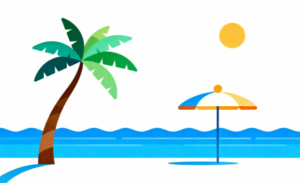 白背景をベースにしているため、イラスト全体が軽やかで清潔感のある印象になり、Webサイトやブログ、SNS投稿、チラシ、バナーなど、幅広いデザインに自然に溶け込みます。ビーチや海、砂浜といった夏の定番モチーフは季節感を演出しやすく、夏のイベント告知や特集ページ、観光やレジャー関連のコンテンツにも相性が良いイメージイラストです。