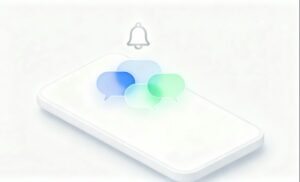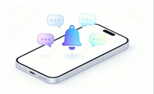スマートフォンの画面に複数の光る通知バブルとベルアイコンが表示された、ミニマルでシンプルなフラットデザインのイラスト素材です。白背景を基調としているため視認性が高く、どなたでも扱いやすいイメージとなっています。通知アイコンが象徴的に配置されており、メッセージ受信、アラート、更新情報など、スマートフォン特有の働きを直感的に伝えることができます。シンプルながらも洗練されたデザインで、ユーザーの注意を自然に引きつけやすい構成になっているのが特徴です。