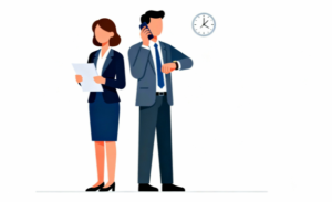 白背景に、時計を見ながら電話で話すビジネスマンと、資料を確認するビジネスウーマンが背中合わせに立っている様子を描いたビジネス系イラスト素材です。ミニマルでシンプルなフラットデザインによって、オフィスでの忙しさやチームワーク、役割分担を自然に表現しており、ビジネスシーンの説明に利用しやすい落ち着いた雰囲気が特徴です。白背景に配置されたキャラクターが視認性の高さを保ち、資料やウェブページに配置しても馴染みやすく、柔軟な使い方ができます。