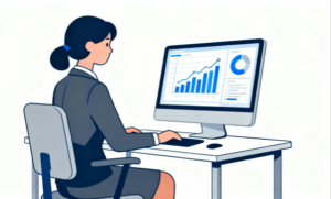 白背景に、パソコンでデータ分析を行うビジネスウーマンを描いたフラットデザインのイラスト素材です。シンプルでミニマルな表現を用いることで、ビジネスシーンにおける分析作業や情報処理の様子が視覚的にわかりやすく伝わります。白背景のため、Webサイトや資料、プレゼンテーション、レポート、オフィス関連のコンテンツなど、どんな場面にも馴染みやすく、背景を気にせず使える点も大きな魅力です。ビジネスウーマンがパソコンに向かいデータを確認する姿は、現代の働き方を象徴するイメージとして幅広く活用できます。