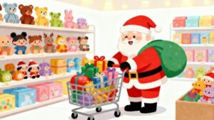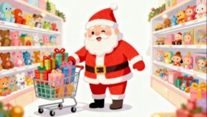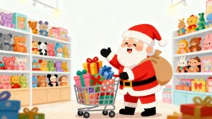 こちらは、クリスマスの象徴であるサンタクロースが、おもちゃ屋で子どもたちへのプレゼント選びを心から楽しんでいる様子を描いたイラストです。ショッピングカートがあふれるほどプレゼントでいっぱいになっており、見ているだけで楽しい気分になれるフリー素材となっています。冬の季節企画やホリデーキャンペーン、プレゼント紹介記事、クリスマスイベント告知などに非常に使いやすいデザインです。