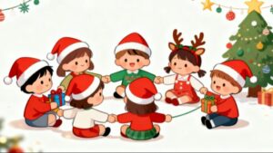 フラットでシンプルなイラスト表現は、印刷物でも画面上でも見やすく、情報を邪魔しません。保育園・幼稚園の雰囲気をやわらかく伝えたいときや、季節感をさりげなく取り入れたいときにおすすめのフリー素材です。子どもたちが輪になって歌う構図は、協調性や楽しさを感じさせ、温かいクリスマスの思い出を連想させます。