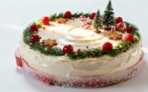 ケーキをぐるりと囲むように配置されたフルーツや飾りは、クリスマス特有の華やかさと可愛らしさを演出し、料理を紹介する際のアクセントとして役立ちます。生クリームの柔らかな表現やフルーツの瑞々しさが際立っており、シンプルな構図でありながら存在感のあるビジュアルとして仕上がっています。季節感を取り入れたデザイン制作に最適な無料イメージとして、ぜひご活用ください。