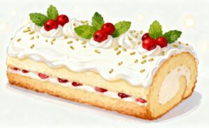 クリスマスの食卓を華やかに彩る、生クリームたっぷりのクリスマスケーキをテーマにしたフリー素材です。スポンジの上にふわふわの生クリームがたっぷりと絞られ、その上にイチゴやラズベリー、クリスマスらしい飾りがぐるっと一周並べられたケーキは、季節の特別な雰囲気を感じさせる魅力的なビジュアルです。おしゃれで温かみのあるケーキのイメージは、クリスマスの料理やパーティーを紹介する投稿内容と相性が良く、鮮やかで華やかな印象を与えてくれます。フルーツの立体感や生クリームの柔らかな質感が見た目にも美しく、クリスマスケーキの魅力を存分に伝える素材となっています。