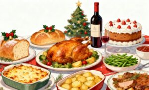 ターキーの丸焼きは、特別な日の料理として多くの家庭で楽しまれており、その見た目の豪華さは見るだけでも祝祭ムードを高めてくれます。クリスマスケーキの華やかさや、おしゃれに盛り付けられた料理が組み合わさることで、パーティーの楽しさや温かい雰囲気が自然と伝わります。写真全体から伝わる明るさと賑やかさは、コンテンツの印象を一段と引き立て、季節の紹介にぴったりなイメージ素材です。