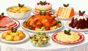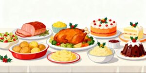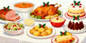 クリスマス関連の記事やイベントのお知らせ、飲食店の季節キャンペーン、レシピ紹介、Web広告、POP制作、SNS投稿など、用途は多岐にわたります。料理の存在感がしっかりと伝わりつつも主張しすぎないため、デザイン全体に馴染みやすく、季節感を自然に演出したい場面にぴったりのフリー素材です。また、オシャレで落ち着いた雰囲気のイラストは、幅広い年齢層に好印象を与えられます。