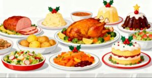 ターキーの丸焼きは、クリスマスの定番として親しまれ、存在感と豪華さで特別な日を演出します。その周りに配置されたケーキや料理は、色合いも華やかでおしゃれな印象を与え、季節の賑やかさや豊かさを表現します。スイーツの優しい色合いや料理の美しい盛り付けが組み合わさることで、暖かいパーティーシーンを自然にイメージでき、コンテンツの雰囲気が一気に華やぎます。