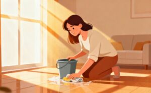 掃除や大掃除に関するブログ記事やコラム、暮らしの情報サイトでは、文章だけでは説明しにくい作業工程を補足するイメージとして活用できます。また、引越や引越し前後の片付けをテーマにしたコンテンツでは、仕上げの掃除や日常的なお手入れを表すイラストとしても使いやすい素材です。ぞうきん、雑巾、バケツといった掃除道具が明確に描かれているため、家事の手順を紹介する記事や、初心者向けの掃除ガイド、チェックリストの挿絵としても適しています。