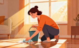 掃除や片付けの基本的な作業を分かりやすく表現した、水拭きをしている人物のフラットデザインイラスト素材です。ぞうきんや雑巾を使い、バケツの水でフローリングを丁寧に水拭きしている様子が、シンプルで見やすいイラストとして描かれています。無駄な装飾を省いたミニマルな構成のため、掃除の流れや作業内容が直感的に伝わりやすく、清潔感やきちんとした印象を与えられる点が特長です。