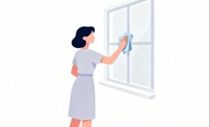 白背景のフラットデザインは、Webサイトやブログ記事、コラムの挿絵として取り入れやすく、掃除や片付けに関する情報を視覚的に補足するのに適しています。背景がシンプルなため、テキストやアイコンを重ねても見やすく、バナーやアイキャッチ画像、SNS投稿用のイメージとしても活用できます。窓拭きは「空間をきれいにする」「気分をリフレッシュする」といった前向きな印象を持たれやすく、暮らしを整える内容や住まいに関するコンテンツとの相性も良好です。