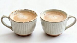マグカップが2つ並ぶ構図は、友人、パートナー、家族など、見る人によってさまざまな関係性を想像できる点も魅力です。具体的な人物を写さないことで、誰にでも当てはめやすいイメージとなり、汎用性の高い素材として利用できます。白背景、コーヒー、ミルク、マグカップ、香りといった要素が、日常の小さな幸せを静かに演出します。