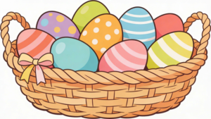 - 幼稚園・保育園・保育所の「春の掲示物」や「園だより」に:4月の入園式や進級祝いの資料、またはエッグハント行事の告知チラシに。カゴに入ったまとまりのあるデザインなので、紙面の四隅や中央に配置するだけで、一気に「春のお祭り」の雰囲気が生まれます。