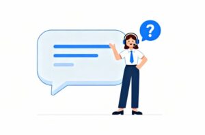 白背景で構成されたシンプルかつミニマルな世界観の中に、ヘッドセットをつけたカスタマーサービス担当者が、チャットバブルと疑問符アイコンの隣に立つ姿が描かれたフラットデザインイラストです。明るくフレンドリーな雰囲気が印象的で、質問や疑問に丁寧に対応するサポート体制を象徴するようなデザインとなっています。白基調の背景により、清潔感と使いやすさが際立ち、サイトのトーンを崩すことなく利用しやすいイメージ素材です。