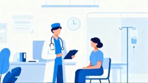 病院の安心感をイメージし、医者と看護師が並んで立つ姿を描いたフラットデザインのイラスト素材です。医師と看護師が連携して患者に向き合う様子を、青と白を基調とした落ち着きのある配色とミニマルな表現でまとめることで、安心感と頼りがいを自然に伝えるイメージに仕上げています。医療現場に求められる清潔感や誠実さを、シンプルな構成の中で分かりやすく表現している点が特長です。