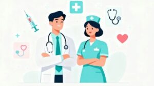 このイラスト素材は、病院やクリニックのWebサイト、医療サービスの案内ページ、診療内容の説明資料などに適しています。医師や看護師の存在をイメージとして示すことで、文章だけでは伝えにくい医療現場の空気感を補い、閲覧者に親しみやすい印象を与えます。フラットな表現のため、他のイラストや写真とも組み合わせやすく、デザイン全体の統一感を保ちやすいフリー画像です。