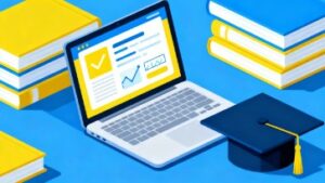 本フリー素材は商用利用可能で、個人ブログから企業サイト、SNS運用、動画制作、印刷物まで、幅広い媒体で安心して使用できます。ベクター形式で作られているため、レイアウトに合わせて自由にサイズ変更ができ、画像の劣化を心配せずに使える点も大きな魅力です。ノートパソコンと参考書という普遍的なモチーフはオンライン学習の象徴としてわかりやすく、読者に学習テーマを自然に伝えることができます。