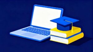 ブルーの背景をベースに、eラーニングの学習シーンをスタイリッシュに表現したフラットベクターイラストです。デスクの上にはノートパソコンと参考書が配置され、オンライン学習や資格勉強、リモート研修などをイメージさせるシンプルでわかりやすい構図となっています。本素材は フラットデザイン を採用した軽やかなタッチが特徴で、Webサイト、ブログ、学習サービスの説明ページ、オンライン講座のサムネイルなど幅広い場面で活用できます。