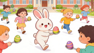 爽やかな風が吹き抜け、新しいお友達との絆も深まるこの季節。保育所や各教育施設では、春ならではの遊びを通じてこどもたちの笑顔を引き出す活動が盛んになりますね。イースターの定番ゲームといえば、スプーンに乗せた卵を落とさないように運ぶ「エッグレース」。本素材は、愛らしいイースターバニーと子供たちが、色とりどりのイースターエッグを運んで一生懸命に走る、躍動感あふれるシーンをフラットデザインで描き出しました。