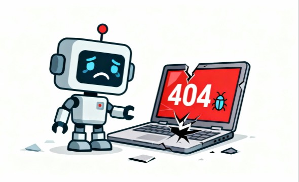 白基調の背景が内容を引き立て、フラットデザインの洗練された雰囲気と相まって、現代的で整った印象を与えます。プログラミング、AI、デジタル技術、UI/UXなど、幅広い分野のコンテンツと親和性が高く、技術ブログやITサービスのサポート記事にも活用しやすいフリー画像です。また、ロボットが象徴する“技術の進歩”と、エラーが示す“トラブル”との対比が、ストーリー性のある視覚表現を生み、資料・サイトのアクセントとしても効果的に使えます。