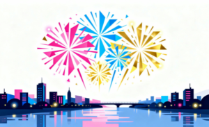 赤や青、黄色などの色彩を用いた花火は、フラットデザインならではの整理された表現で描かれており、視認性が高く、見た瞬間に「夏」を連想させます。細部を描き込みすぎないことで、街や川、花火それぞれのモチーフがバランスよく配置され、全体として洗練されたイラストに仕上がっています。白背景のため、余白が美しく、デザイン全体に軽やかさを与えている点も特長です。