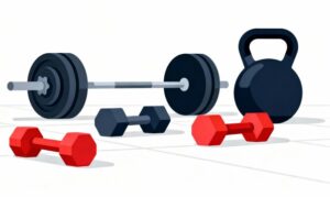白基調の背景に、ダンベル・バーベル・ケトルベルなどのウェイト器具を整然と並べた、ミニマルなフラットデザインイラスト素材です。ジムのトレーニング風景をシンプルに表現しながら、家トレや筋トレの魅力が直感的に伝わるように構成されているのが特徴です。余計な装飾を省いたフラットスタイルにより、運動やフィットネスのイメージがすっきりと伝わり、健康やボディメイクをテーマとしたコンテンツにも馴染みやすい仕上がりです。