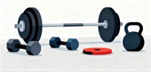 白基調の背景に、ダンベル、バーベル、ケトルベルなど複数のウェイト器具が整然と並べられた、ミニマルで洗練されたフラットデザインのイラスト素材です。ジムで使用される代表的なトレーニング器具がシンプルにまとめられ、筋トレやフィットネスといったテーマの雰囲気を直感的に伝えてくれる構成になっています。白背景により清潔感があり、視認性が高いため、家トレの解説、運動習慣の紹介、ウェイトを使ったトレーニングの記事などとの相性が非常に良い素材です。