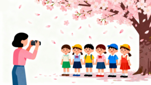 今回のイラストは、大きな桜の木の下に園児たちが集まり、みんなで並んで記念撮影をしている場面をモチーフにしています。空にはひらひらと桜の花びらが舞い、お祝いのムードをより一層引き立てています。