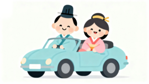 ひなまつりといえば、3月3日に飾る静かなひな人形を思い浮かべる方が多いですが、本イラストではその固定観念をやさしくくずし、「もしお内裏さまとお雛さまが外に出かけたら」という想像を形にしています。軽トラックでのドライブという少し意外な組み合わせが、おもしろ画像としての魅力を高め、見る人の印象に残りやすいデザインになっています。