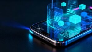 スマートフォンから未来的なデータやグラフが飛び出すように表現された、近未来のITシーンをイメージしたイラスト素材です。IT や ICT 分野の説明にぴったりのビジュアルで、情報が空間に広がるような立体的表現が特徴です。クラウドシステムやデータ管理、デジタル化をテーマとした資料や Web サイトに自然と馴染み、シンプルながらも高い情報量を感じさせるデザインになっています。