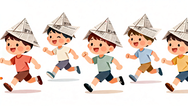 爽やかな五月の青空の下、子どもたちの健やかな成長を願う「こどもの日」。日本の伝統行事である端午の節句において、保育所や幼稚園で欠かせない遊びの一つが、新聞紙を使った兜作りです。大きな紙を一生懸命に折り、完成したかぶとを頭に乗せてヒーロー気分で遊び回る子供たちの姿は、いつの時代も変わらない微笑ましい光景です。本素材は、そんな園生活や学校生活の活発な瞬間を、使い勝手の良いシンプルでモダンなフラットデザインで描き出しました。